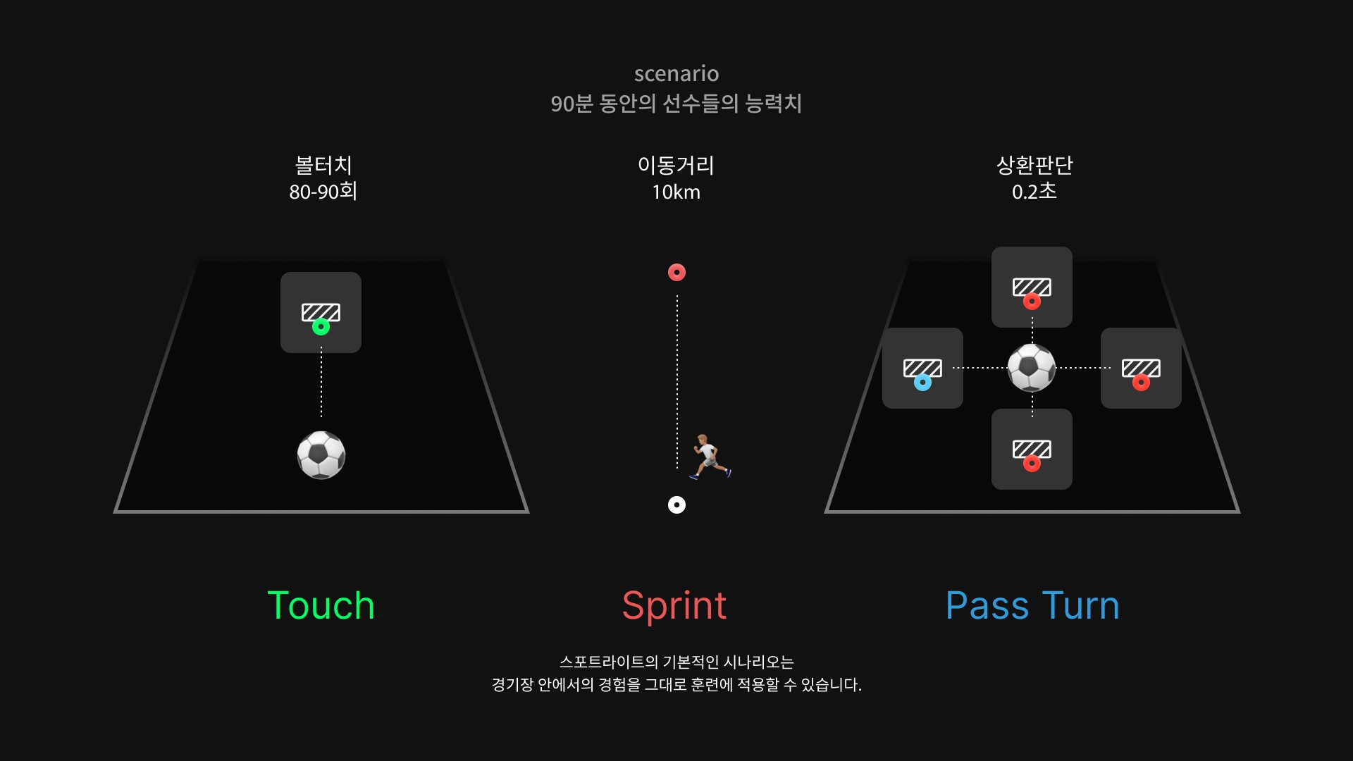 이처럼 기본적인 훈련 프로그램은 경기장 안에서 일어나는 모든 상황을 장비에 적용하여 사용할 수 있습니다.